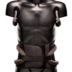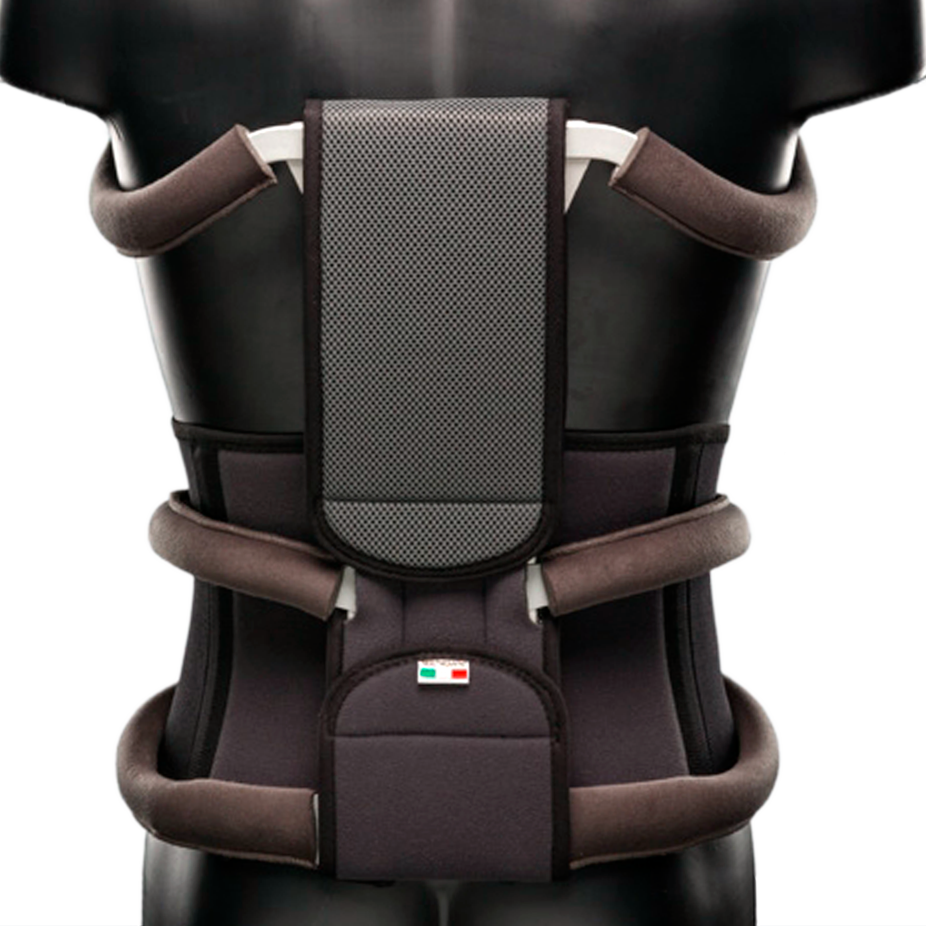 Struttura in lega leggera e acciaio plastificato. Imbottiture in gommapiuma foderata. Pelotine delta-pettorali imbottite. Montanti ascellari scaricati e regolabili in altezza. 2 astine di collegamento iliaco-ascellare “N”.
